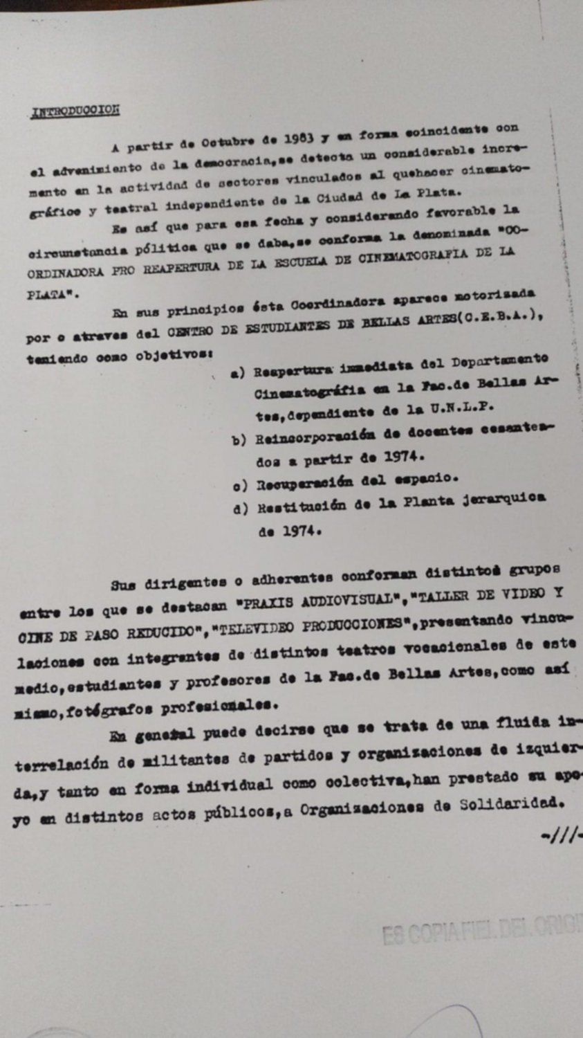 Como señala el documento confeccionado por los espías, la iniciativa comprendía cuatro ejes definidos por los miembros de la Coordinadora: reapertura inmediata del Departamento de Cinematografía en la Facultad de Bellas artes, reincorporación de docentes cesanteados a partir de 1974, recuperación del espacio edilicio y restitución de la planta jerárquica de 1974. Los sabuesos advertían sobre una “fluida interrelación de militantes de partidos y organizaciones de izquierda”, entre los que nombra, en relación a los movimientos específicamente ligados al cine, a “Praxis Audiovisual”, “Taller de Video y Cine de Paso Reducido” y “Televideo Producciones”.