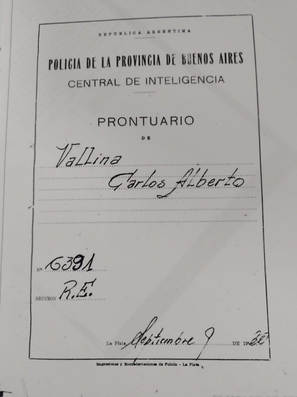 Ficha personal de Carlos Vallina en la DIPPBA, que investigó secretamente sus tareas como militante
