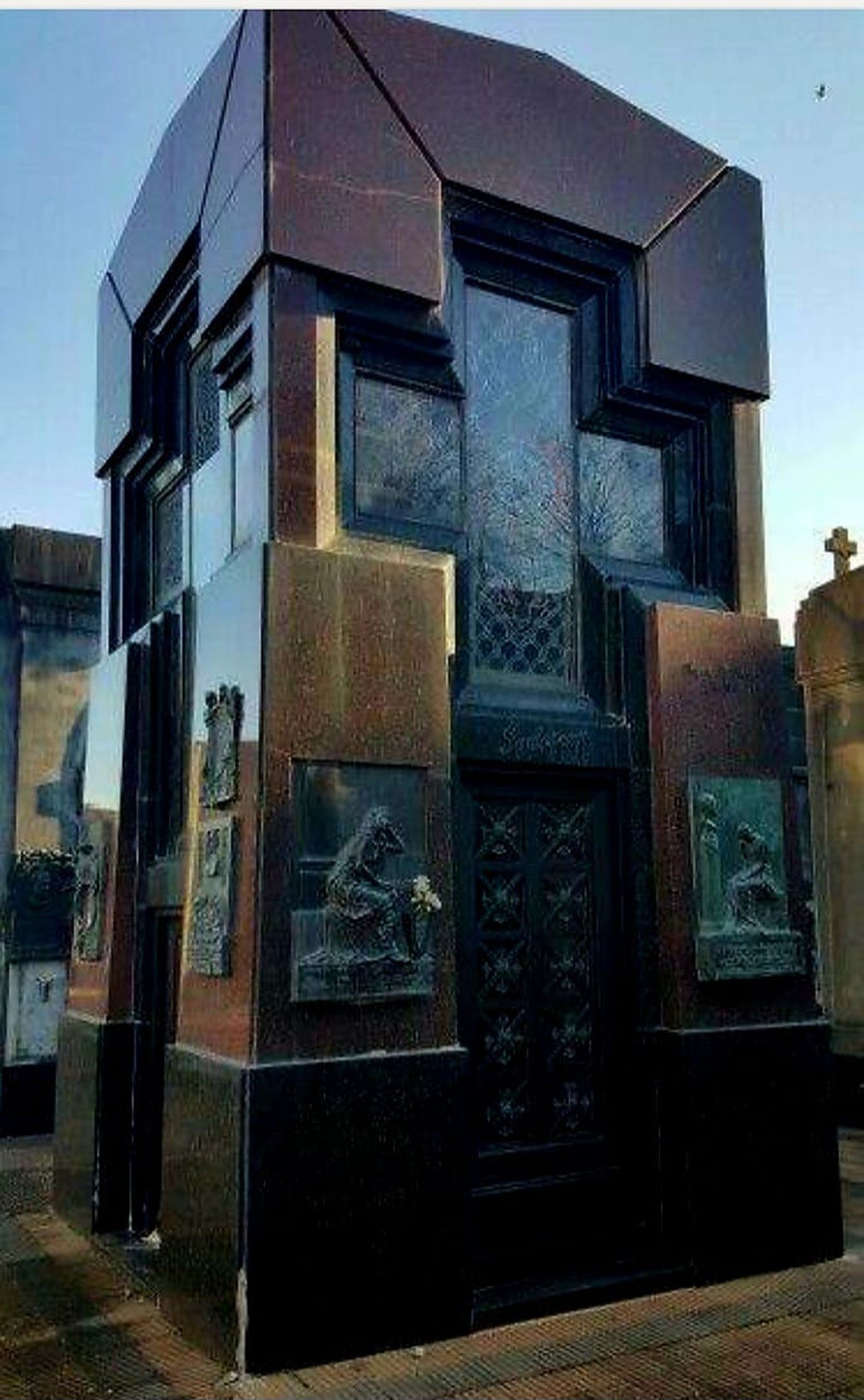 Pedro Etchegoyen, médico de Burzaco y masón, murió joven. Tras su fallecimiento, su esposa Fortunata Di Franco se trasladó a La Plata, donde fue profesora de Literatura en la Escuela Normal y luego inspectora de Escuelas. Junto a Emilia Carlota Salza, también masona, participó en logias femeninas como Las Hijas de Isis. Salza fue directora de la Escuela Normal N°1 e integrante de la Liga Nacional de Mujeres Librepensadoras. La bóveda familiar destaca por su rica simbología: adopta la forma de un pilón egipcio rematado en hojas de palma. En el frontón aparece la inscripción del templo de Isis en Sais: “Yo soy el que soy, he sido y seré; ningún mortal ha descorrido jamás el velo que me oculta”. Presenta la Cruz Ansada (ankh), frisos monocromáticos, medallones con cabezas egipcias y motivos Isis-Osiris en las jambas. La puerta y el frontón incluyen símbolos alados, corona circular y los delfines psicopompos, junto a flores y hojas de loto de ocho pétalos, representando la armonía cósmica, el renacimiento y la plenitud espiritual.