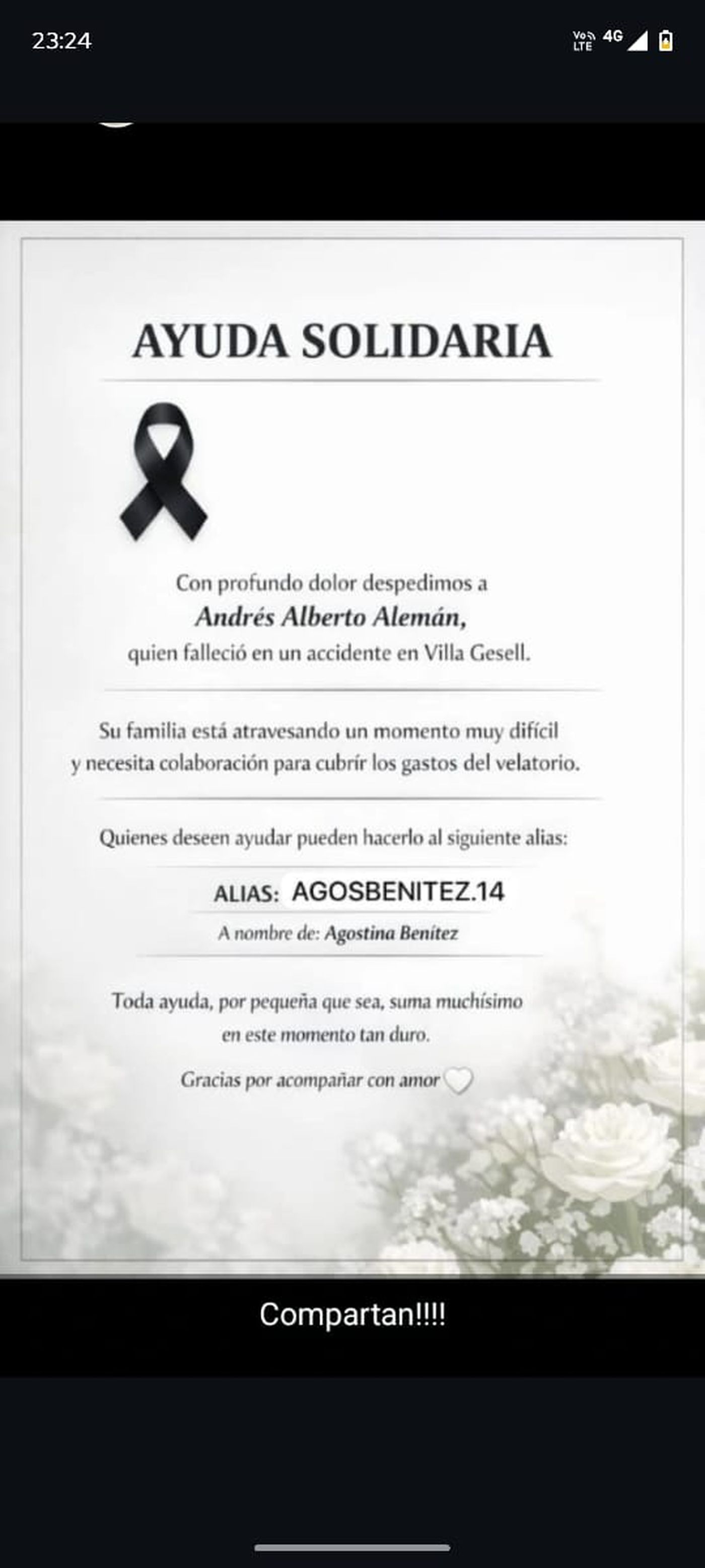 Quien puedan y deseen colaborar puede hacerlo al siguiente alias que compartió la familia del joven fallecido: AGOSBENITEZ.14, a nombre de Agostina Benítez