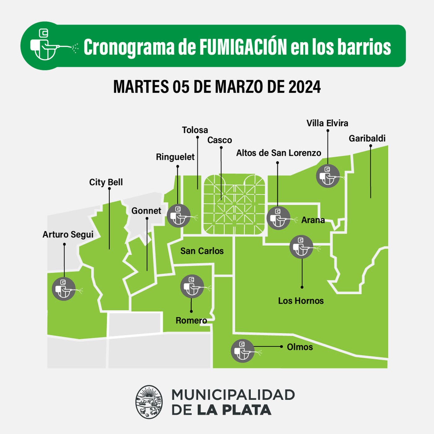 La Municipalidad de La Plata sigue con las tareas de prevención y fumigación de mosquitos. Este martes trabajarán tanto en el casco urbano como en diversas localidades del partido con la finalidad de contener a los insectos que transmiten el Dengue y la Encefalomielitis Equina que atormentan a la región.