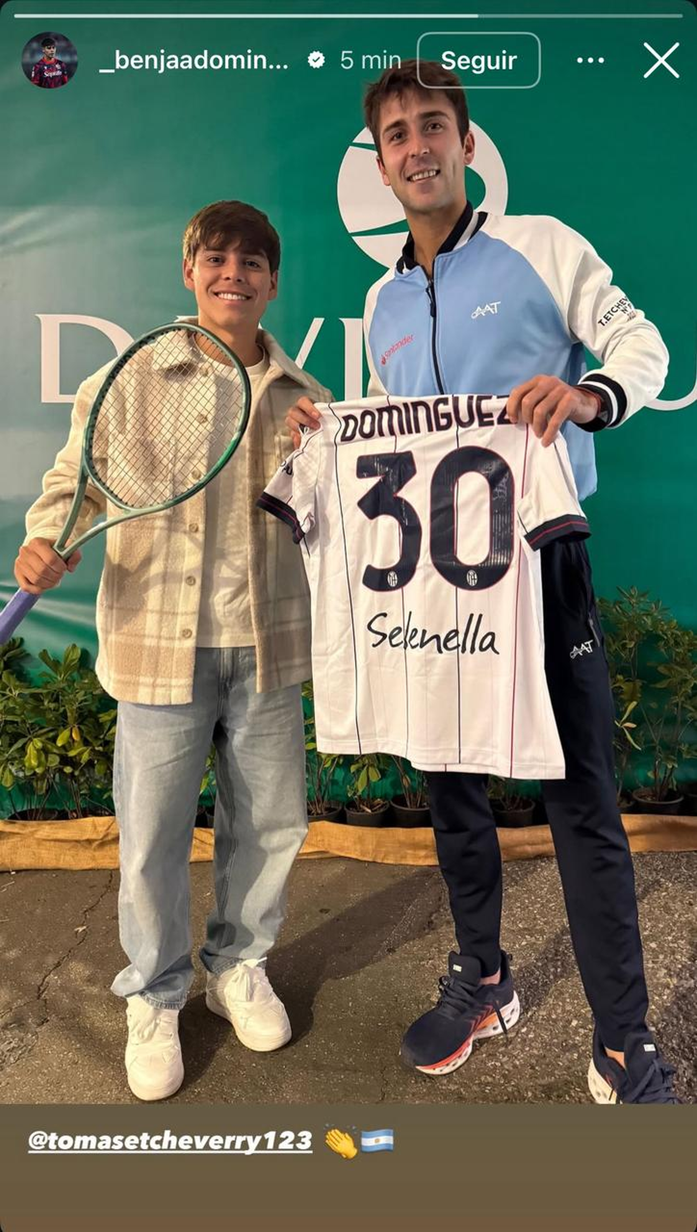 La imagen fue publicada por Domínguez en sus redes sociales, donde se lo ve posando junto a Etcheverry con la camiseta firmada, acompañada de un mensaje y emojis argentinos. El gesto se dio pocas horas después del triunfo del tenista, que abrió de forma brillante la serie para Argentina.
