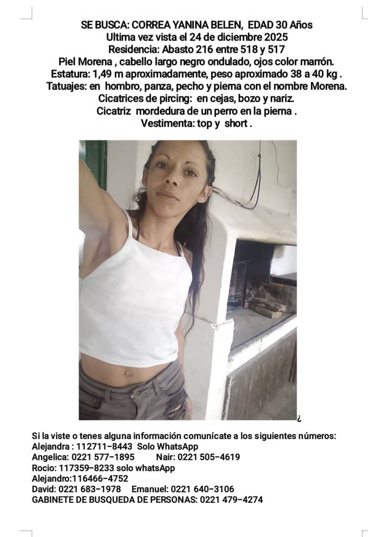 Buscan desesperadamente a Yanina Belén Correa, una mujer de 30 años de La Plata que fue vista por última vez el 24 de diciembre de 2025, en la víspera de Navidad. Desde entonces, su familia y allegados no volvieron a tener contacto y piden colaboración urgente para dar con su paradero.