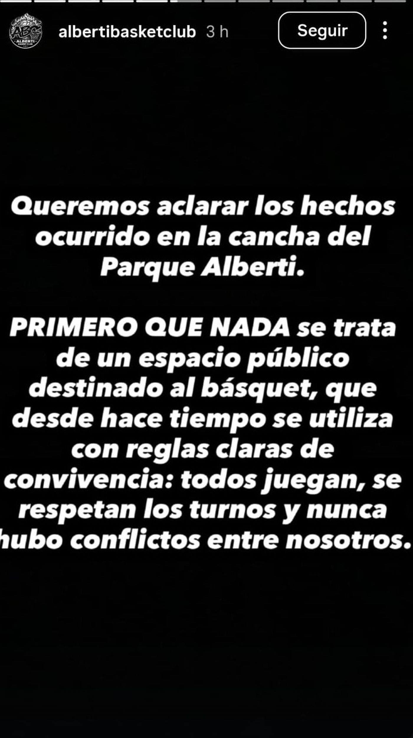 Los basquetbolistas que suelen jugar en Parque Alberti se agrupan en la comunidad Alberti Basket Club (ABC), que tiene cuenta de Instagram. A través de la misma, publicaron su descargo. "Queremos aclarar los hechos ocurridos en la cancha del Parque Alberti", comienza y agrega: "Primero que nada, se trata de un espacio público destinado al básquet que desde el último tiempo se utiliza con reglas claras de convivencia: todos juegan, se respetan los turnos y nunca hubo conflictos entre nosotros".