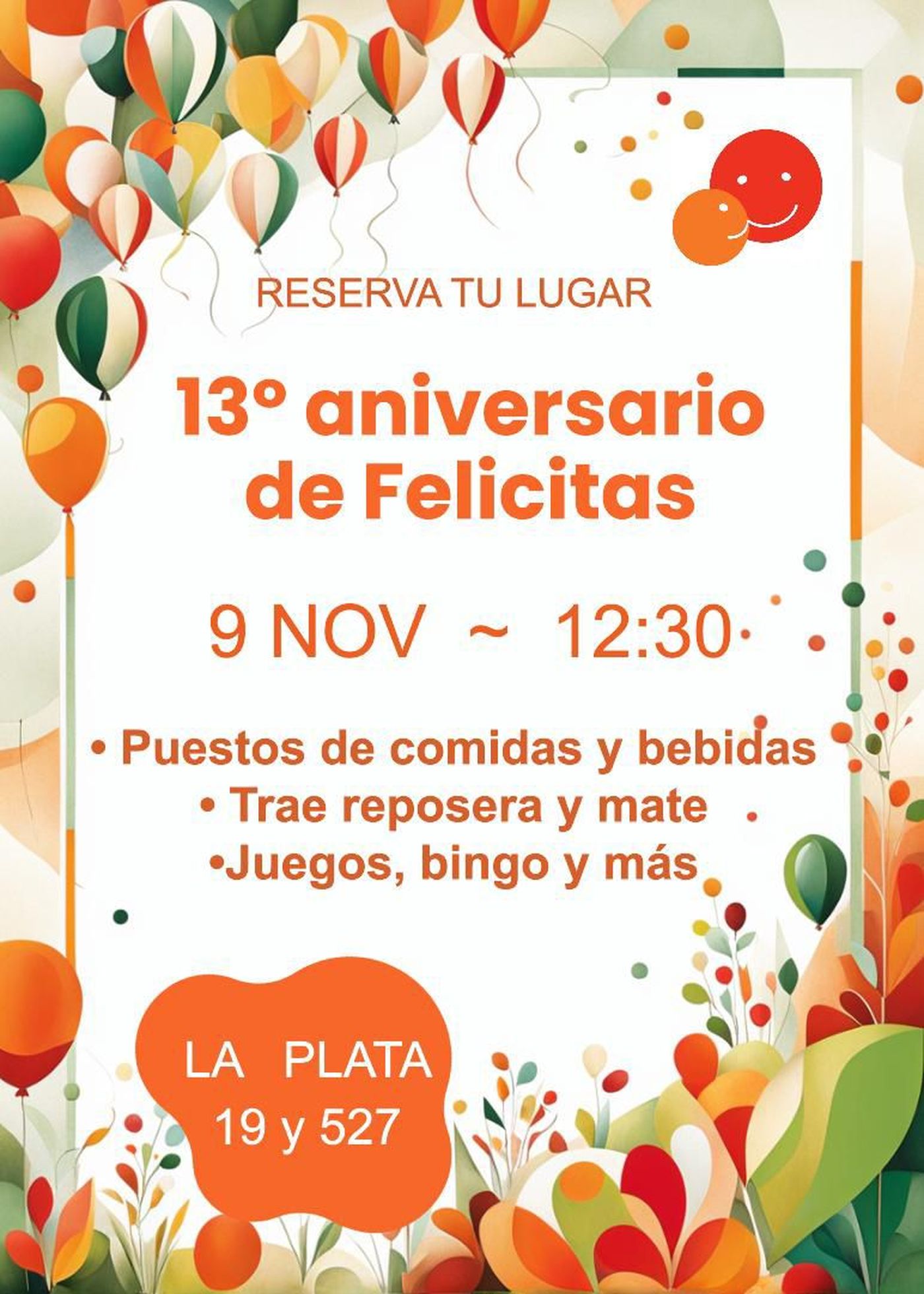 La Asociación Felicitas para el Desarrollo de la Niñez celebrará su 13° aniversario el domingo con un evento en La Plata. La organización, que se encarga de buscar familias para la adopción transitoria de niños en situación de vulnerabilidad, realizará una jornada con juegos y puestos de comida.