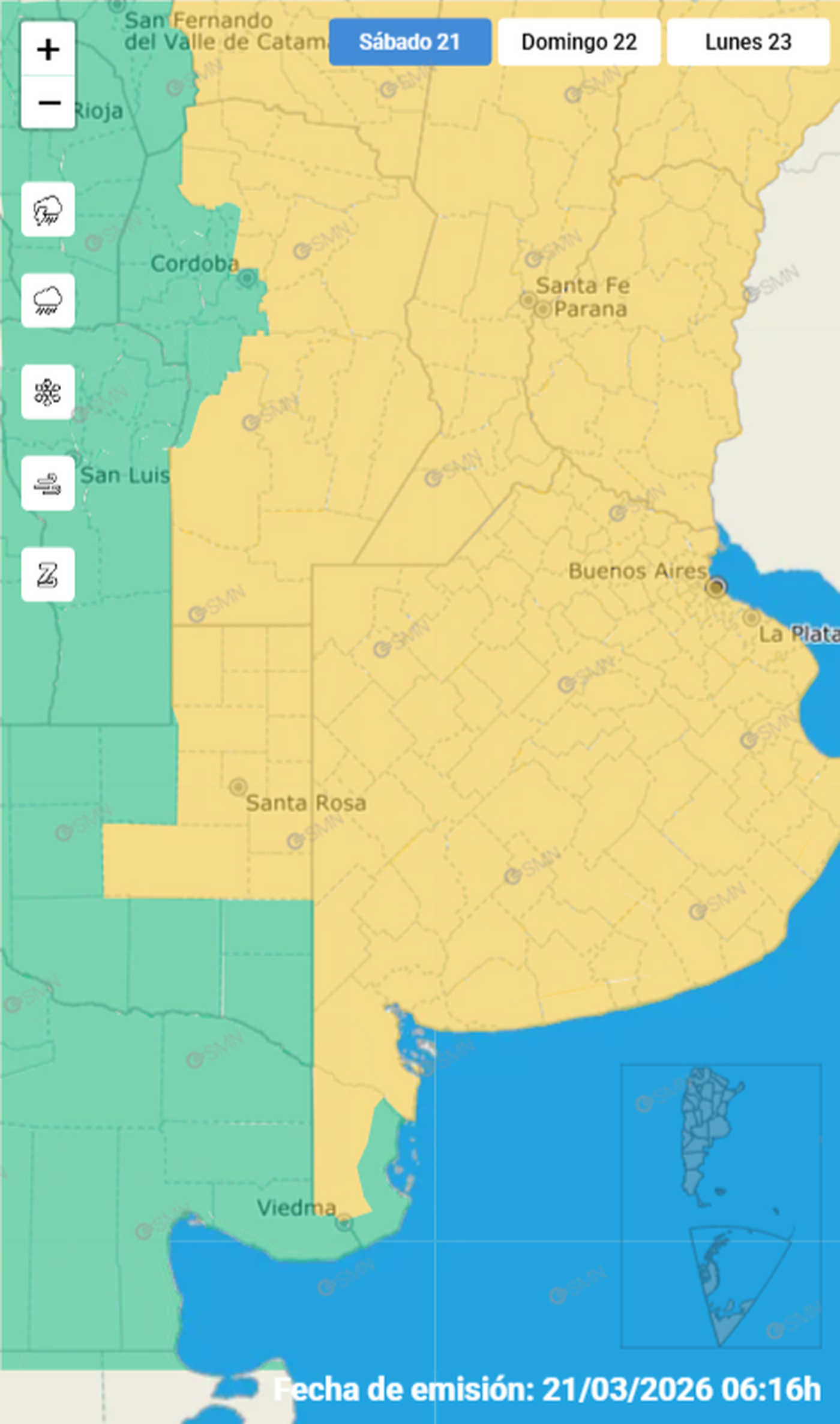 A las 6 de este sábado, el organismo actualizo su sistema de advertencias tempranas, ubicando a casi toda la provincia de Buenos Aires en alerta amarilla, por lo que se recomienda precaución, especialmente en horas de la tarde.