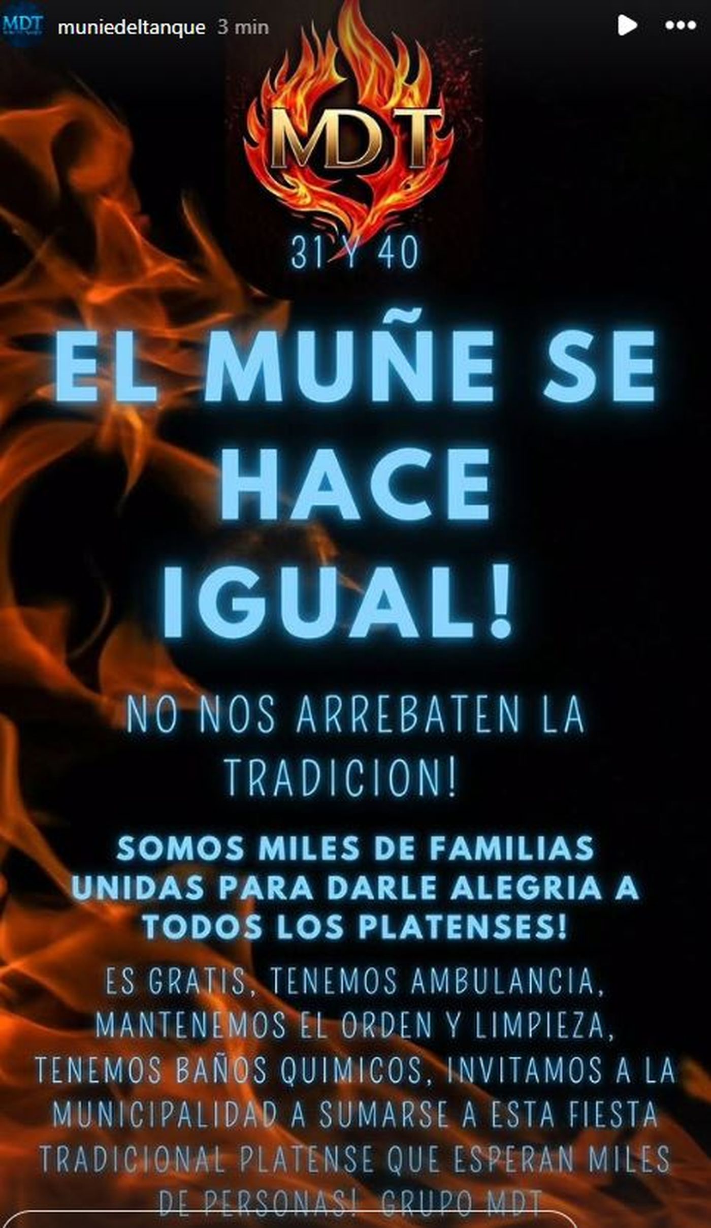 En otra de sus historias publicada pasadas las 16, informan a los vecinos que el evento se hace. "No nos arrebaten la tradición", reclaman y agregan "somos miles de familias unidas para darle alegría a todos los platenses.