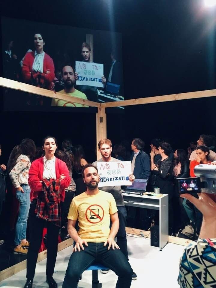 - Para iniciar nuestra investigación partimos conceptualmente de algunas ideas del filósofo y activista Franco “Bifo” Berardi, de quien nos interesó su mirada crítica sobre las nuevas evoluciones del capitalismo, la precarización y flexibilización laboral, la fractalización del tiempo de trabajo y los síntomas que estos nuevos fenómenos producen en el modo de vincularnos con el otro. Durante nuestro proceso creativo intentamos establecer un vinculo directo entre estos fenómenos sociales y tecnológicos con procedimientos estrictamente teatrales que conviertan a este marco teórico en materia escénica. Algunos de los interrogantes más inmediatos que se pueden leer en el programa de mano que les ofrecemos a los espectadores, son: ¿Cómo podemos generar una atención multitasking en la actuación? ¿Cómo transformamos la fractalización del tiempo en materia escénica? ¿Que sucede si el contenido de la obra es mayor al tiempo de duración?. Contábamos con treinta ensayos, y esto para las lógicas de producción que manejamos en el teatro independiente, es bastante acotado. Entonces decidimos transformar y repensar esta especie de dificultad, en una obstrucción potenciadora. Decidimos pensar formas y estrategias de construir una determinada complejidad a nivel actoral, dramatúrgico y escénico. Para ser más concreto, la obra en cantidad de páginas podría durar aproximadamente, una hora y media, pero a través de todos los procedimientos investigados nuestro trabajo dura cuarenta y cinco minutos. Logramos atravesarnos, creemos, por una lógica multitasking, en dónde la obra pasa de una escena a otra rápidamente y sin progresiones orgánicas, sino más bien, cómo dice Berardi: Intentamos la implacable apropiación y dominio del tiempo y de la experiencia. Y terminamos colapsados.