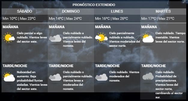 El Servicio Meteorológico Nacional (SMN) anunció buenas condiciones climáticas para el próximo fin de semana. De acuerdo con el pronóstico del tiempo, los platenses podrán disfrutar el sábado de la mejor manera: con una mínima de 10°C será el día más frío del fin de semana, pero con una máxima prevista de 23°C también será el más soleado. El domingo, en tanto, podría haber un aumento de la nubosidad y en ese marco se espera un clima templado con una mínima de 14°C y una máxima 24°C.