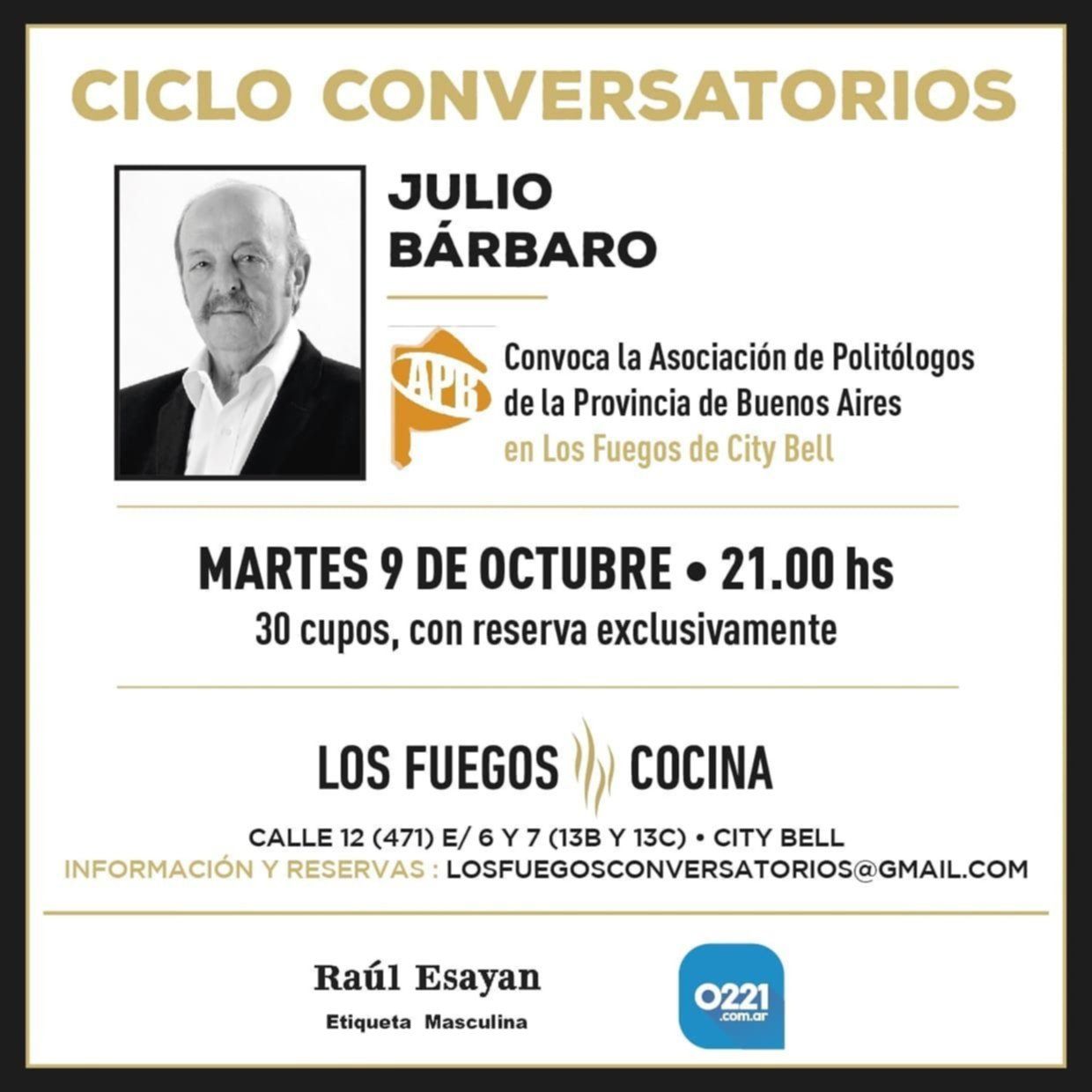 La primera edición contará con la presencia del politólogo Julio Bárbaro, este martes a las 21 en el restaurante Los Fuegos, calle 12 (471) entre 6 y 7 (13B y 13C), de City Bell.