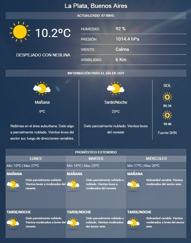 Para este domingo las condiciones climáticas señalan que el sol será el protagonista en el cielo y algunas nubes aparecerán en horas de la tarde, aunque no causarán problemas. Según el Servicio Meteorológico Nacional, soplarán vientos leves desde el sector sur y luego en direcciones variables.