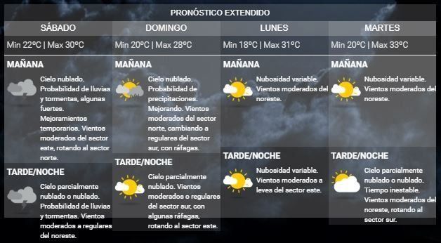Lo cierto es que el pronóstico no es nada alentador y se espera un mal tiempo para los próximos sábados y domingo, con temperaturas que variarán entre los 20°C y los 30°C a lo largo de las dos jornadas de descanso.