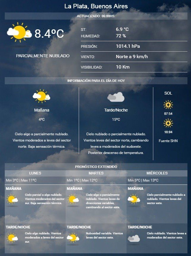 Se termina el fin de semana y el pronóstico indica que, con un buen abrigo, se podrá disfrutar al aire libre. Para este domingo se espera una mínima de 4° y una máxima que alcanzará los 15°. El cielo estará algo nublado por la mañana e irá aumentando la nubosidad en horas de la tarde.