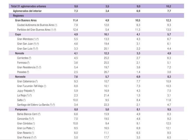 De esta manera, se ubicó solo por detrás de los partidos del Gran Buenos Aires -que encabezaron el preocupante podio con el 12,4%, seguido por-, Rawson-Trelew (11,7%), Santa Rosa (11,1%), el Gran Córdoba (10,8%) y Salta (10%).