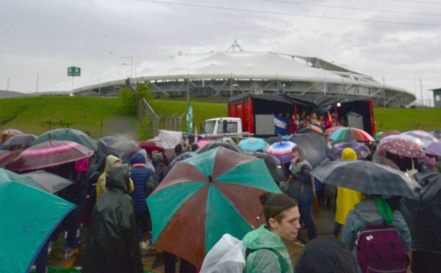 Imparables. Ni el diluvio, ni los rayos, ni el viento frenaron la marea multicolor en las inmediaciones del Estadio Único. El #EncuentroFeminista empezó con pésimo clima, pero con euforia y alegría en La Plata. Con paraguas, pilotos descartables o directamente bajo el agua, una multitud se acercó a la zona de 25 y 529, donde pese a la suspensión de la apertura por parte de la Comisión Organizadora, se realizó el acto de la Campaña #SomosPlurinacional. Los relatos, las vivencias y las expectativas ante el pogo feminista más grande del mundo.