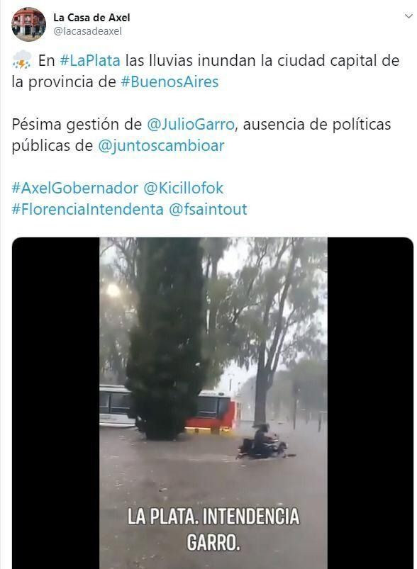 Este sábado, mientras la ciudad era azotada por un fuerte temporal, se produjo un hecho que claramente puede ser denominado como: campaña sucia. Desde la cuenta de Twitter @lacasadeaxel, publicaron imágenes de Parque Saavedra inundado y criticando fuertemente al intendente Julio Garro.