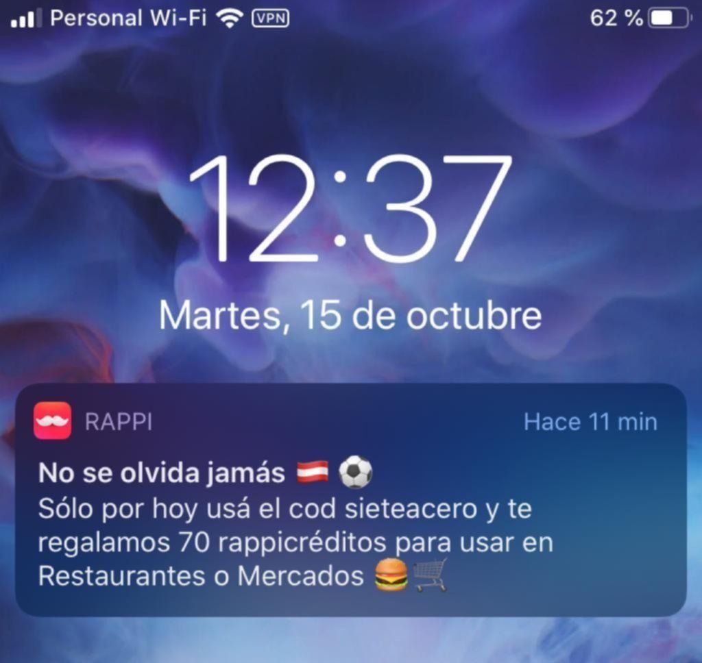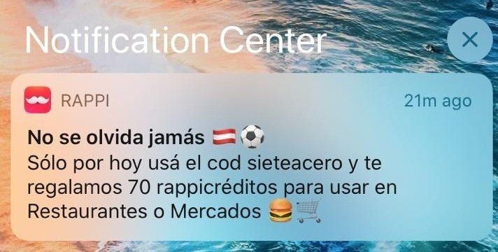 En una arriesgada y polémica jugada de publicidad, la empresa Rappi dispuso este martes una particular promoción para sus usuarios. “Solo por hoy usá el cod sieteacero y te regalamos 70 rappicréditos para usar en Restaurantes o Mercados”, dice parte de la notificación que llegó a los teléfonos de los adheridos a esta empresa.