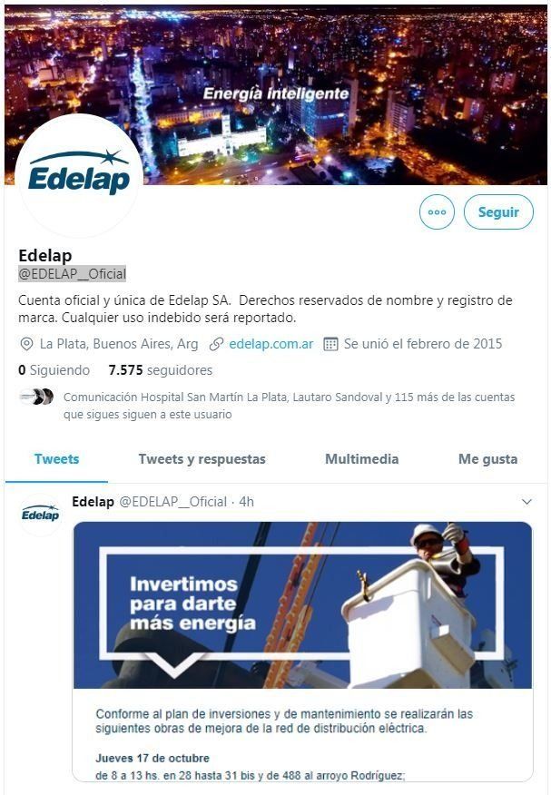 La imagen despertó una fuerte polémica en las redes sociales, pero lo cierto es que el tuit no figura entre los últimos mensajes difundidos en la cuenta oficial de la empresa @EDELAP__Oficial. Allí puede verse que la última publicación refiere a un informe sobre los cortes programados para el próximo jueves.