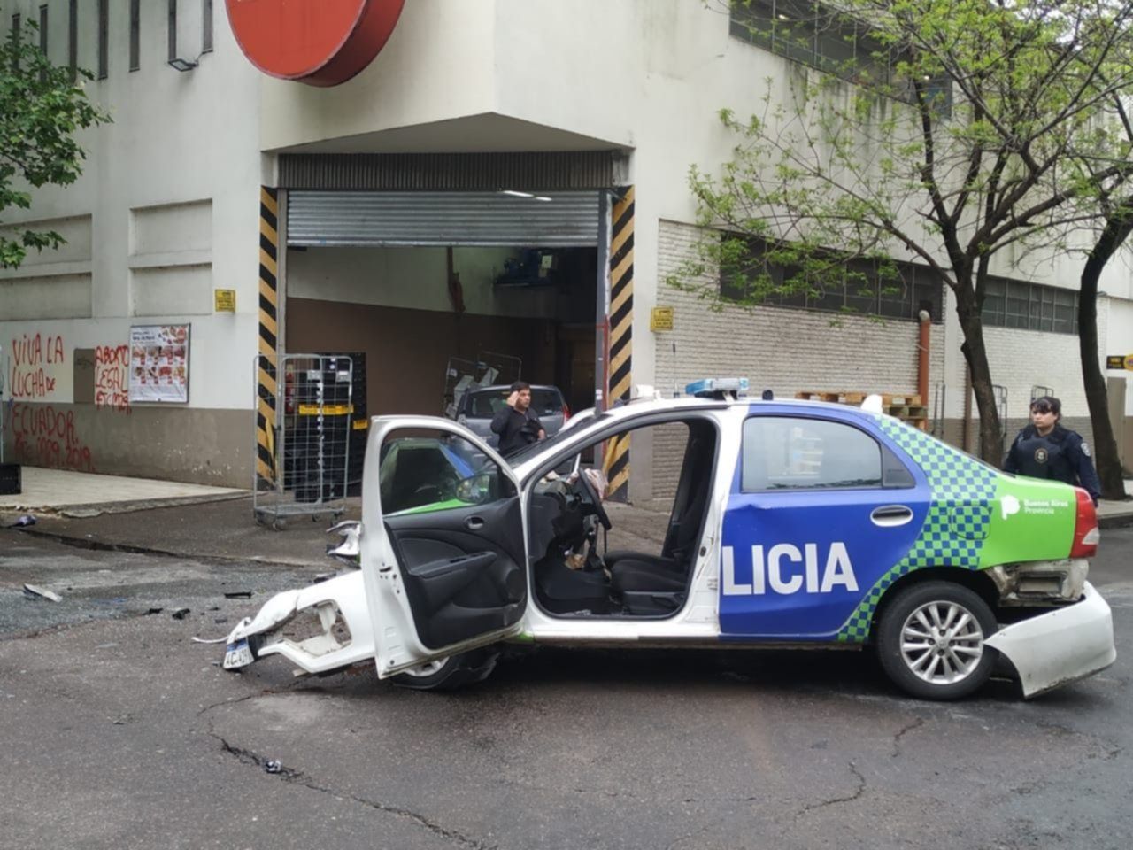 Este miércoles arrancó con un espectacular choque en la esquina de calle 5 y 56, justo en la entrada del depósito del supermercado Disco. Allí un patrullero terminó chocando contra un Renault Sandero, haciendo que este terminara incrustado dentro del dicho lugar.