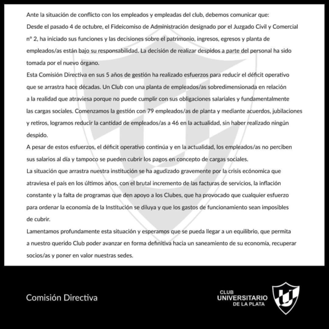 Ante este panorama, la Comisión Directiva del Club Universitario sacó un comunicado. Luego de remarcar que el Fideicomiso de Administración designado por el Juzgado Civil y Comercial N° 2, inició sus funciones el pasado 4 de octubre, remarcó que “las decisiones sobre el patrimonio, ingresos, egresos y planta de empleados/as están bajo su responsabilidad”. “La determinación de realizar despidos a parte del personal ha sido tomada por el nuevo órgano”, explicaron.