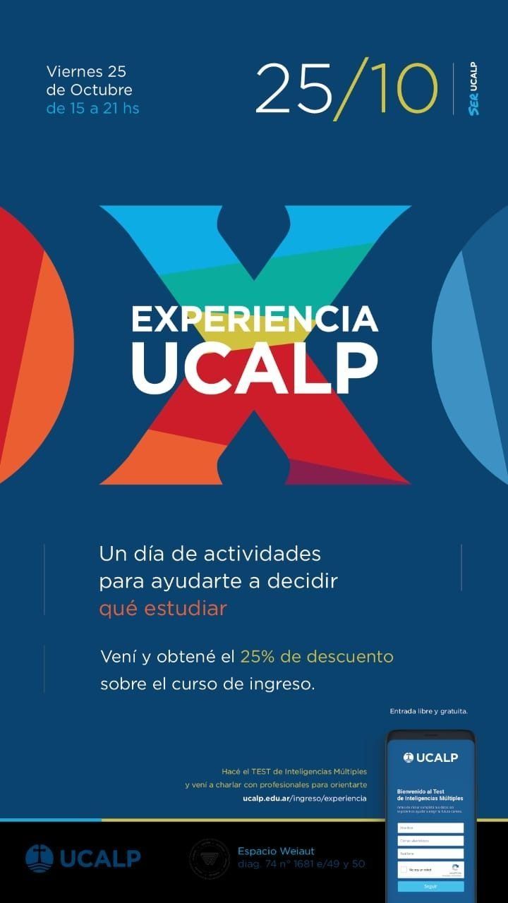 Experiencia UCALP se realizará este viernes, en el espacio WEIAUT ubicado en Diag. 74 entre 49 y 50. La participación es libre y gratuita, y cabe destacar que aquellos que se preinscriban durante el evento obtendrán una bonificación del 25% sobre el arancel del curso de ingreso. Al mismo tiempo, por cuestiones de organización se pide a los interesados que reserven su lugar dejando los datos en el formulario cargado en www.ucalp.edu.ar/ingreso/experiencia/.
