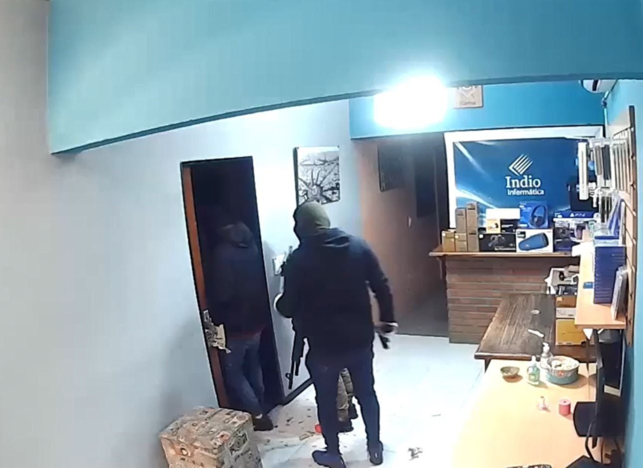 Cinco delincuentes armados causaron terror en el barrio La Loma, luego de haber ingresado a una vivienda en la que funciona un local informático. Encapuchados y con guantes, forzaron el acceso principal y se metieron en la propiedad con una llamativa violencia. La secuencia quedó registrada en una de las cámaras de seguridad del lugar, que ya está en poder de las autoridades.