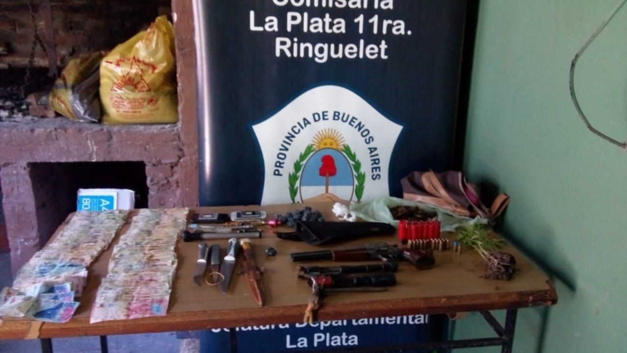 Durante el procedimiento, las autoridades incautaron tres envoltorios con cocaína, numerosos paquetes con marihuana (con un total de 193 gramos), una planta de la misma sustancia, un pistolón calibre 14, doce cartuchos del mismo calibre, dos cartuchos de escopeta 12/70, quince proyectiles 9 milímetros, un cartucho 22 L, dos armas tumberas y $2455 en billetes de distinta denominación.