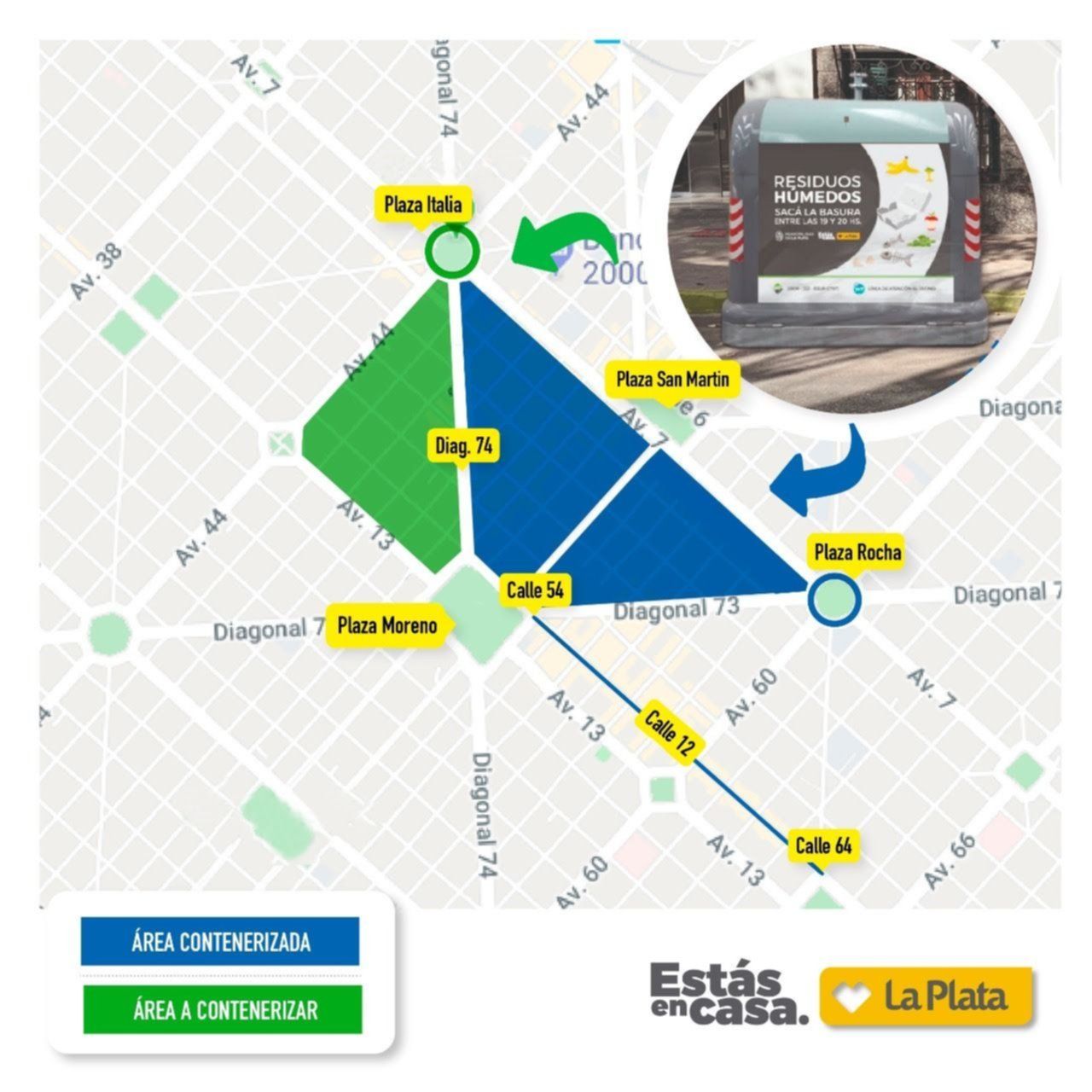 En ese sentido, las autoridades informaron que el personal del área municipal trabaja en la instalación de nuevos contenedores en un triángulo conformado por Plaza Italia, en 7 y 44; sobre la avenida 44 desde avenida 7 (Plaza Italia) hasta avenida 13 (Plaza Paso); a lo largo de avenida 13 desde 44 (Plaza Paso) hasta calle 50 (Plaza Moreno), comprendiendo toda la zona de Tribunales; y sobre diagonal 74 desde Plaza Moreno (calle 50) hasta Plaza Italia (avenida 44).