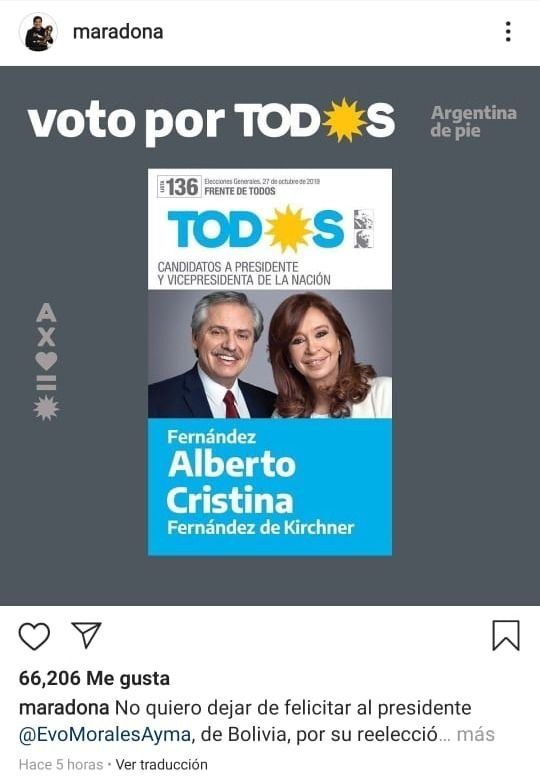 Diego Maradona volvió a despertar polémica con una publicación en sus redes sociales. Esta vez fue por compartir la boleta del Frente de Todos y un sentido mensaje: "Este domingo, en nuestro país, vuelve a ganar la verdad, de la mano de Alberto Fernández y Cristina Fernández de Kirchner", lanzó el Diez.