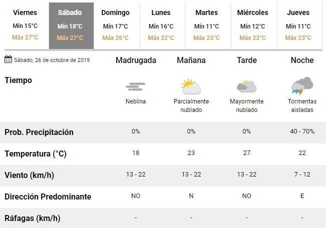 Según adelantaron los meteorólogos del SMN, para el sábado se espera una jornada con abundante nubosidad y un clima que irá desmejorando a lo largo del día, cerrando la jornada con la posibilidad de algunas "lluvias aisladas".