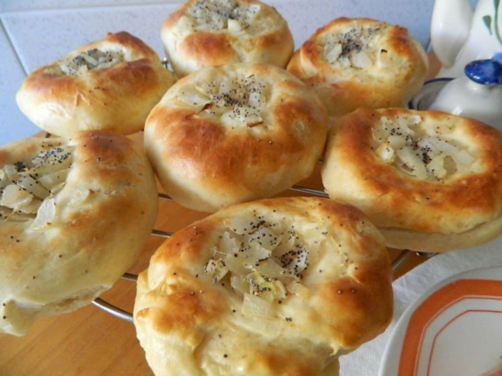 Por último se deberá cubrir cada uno con un poco de la cebolla preparada y espolvorearlos con las semillas de amapola. Finalmente, colocarlos en una asadera aceitada y hornearlos a fuego moderado hasta que se doren.