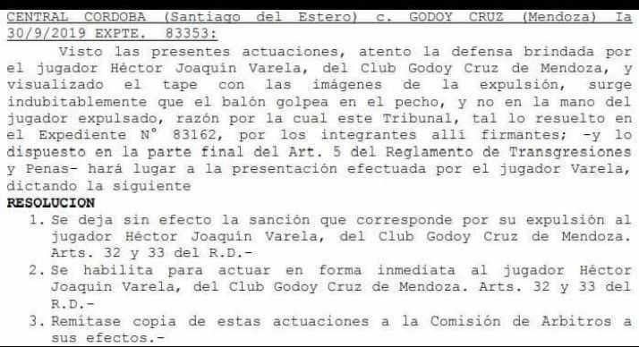 La razón por la cual el defensor podrá estar presente frente al Lobo es que finalmente desde el Tribunal de disciplina le dieron la razón al Tomba, que había reclamado sobre el accionar de Pablo Echavarría, quien expulsó erróneamente a Varela.