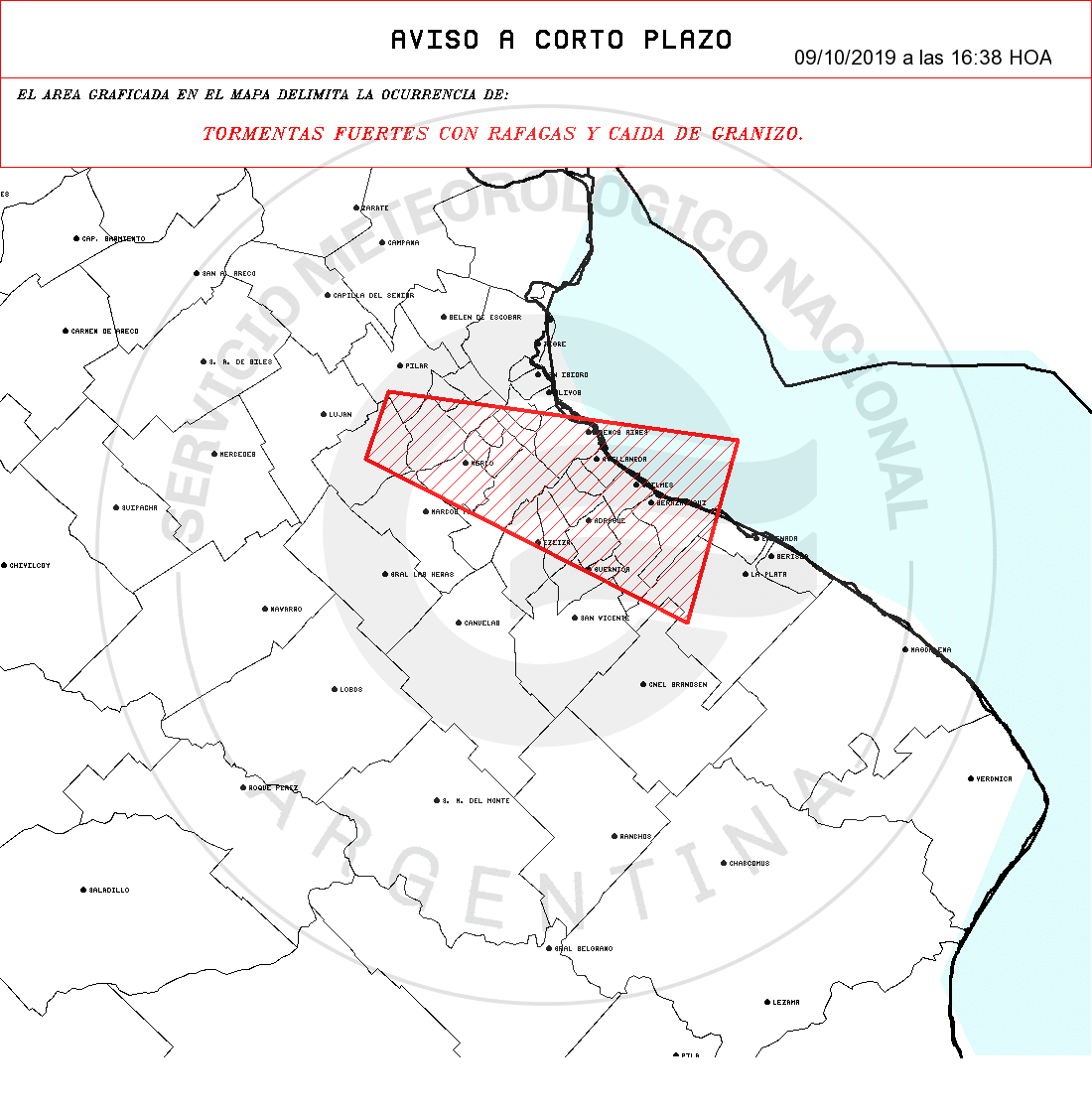 El SMN emitió el aviso a las 16.38 y agregó que el mismo tendrá validez durante al menos tres horas después de dicha publicación, cuando el organismo vuelva a brindar información sobre la evolución del tiempo en la ciudad y la región.