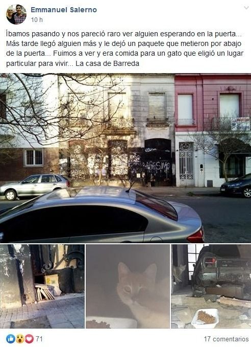 "Íbamos pasando y nos pareció raro ver a alguien esperando en la puerta. Más tarde llegó alguien y le dejó un paquete que metieron por abajo de la puerta. Fuimos a ver y era comida para un gato que eligió un lugar particular para vivir... la casa de Barreda", escribió Emmanuel Salerno en su cuenta de Facebook para compartir lo que había visto en la vivienda de 48 entre 11 y 12.
