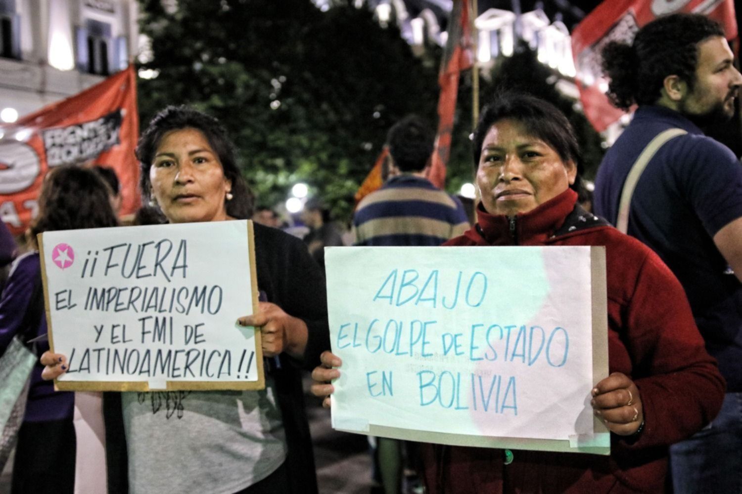 Con las consignas "No al golpe de Estado en Bolivia" y "Fuera el imperialismo de América Latina", los organizadores alientan a "la defensa del Estado Plurinacional" y se preparan para otra concentración que se realizará el lunes en el obelisco de Buenos Aires.