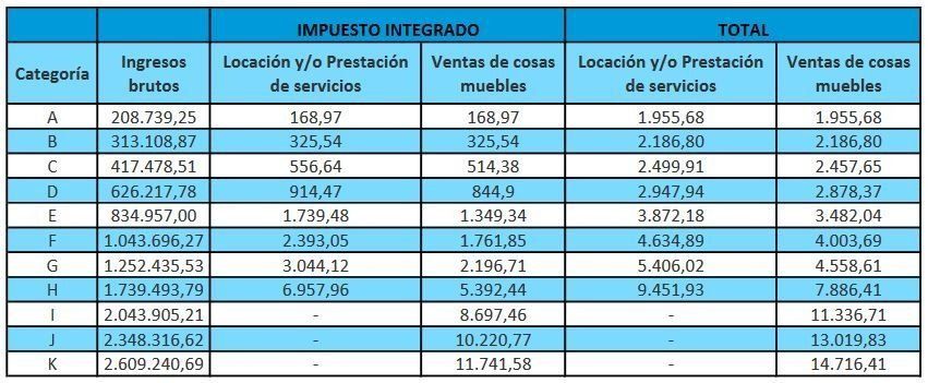 Ahora bien, ¿cuáles serán los aportes mensuales que se deban hacer para cada categoría? La "A", la más baja, pasará de $1.294 a $1.955; la "B", de $1.447 a $2.186; la categoría "C", de $1.654 a $2.499 por prestación de servicios y de $1.626 a $2.457 por actividad comercial; la "K", la más alta, de $9.738 a $14.716.