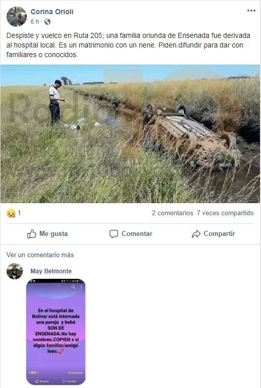 Una familia de Ensenada protagonizó un despiste y vuelco en Bolívar: tres personas resultaron heridas. Además, iniciaron una campaña para dar con sus allegados.