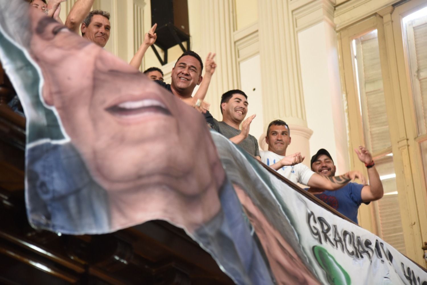 Promediando la sesión, a las barras del Concejo llegaron integrantes del Sindicato de Camioneros que desplegaron una bandera para saludar a Miguel Forte, el secretario general de ese gremio que concluye su segunda etapa como concejal. Y apenas concluido el sumario, la presidenta habilitó a que lo ediles dedicaran unos minutos para saludar después de cuatro años de gestión.