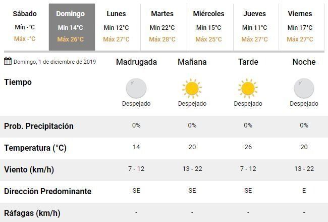 De acuerdo con su pronóstico, las buenas condiciones del tiempo continuarán durante los próximos domingo y lunes, pero agregaron que "el martes aumentarán las temperaturas y sobre el final de la tarde podrían registrarse algunas tormentas aisladas".