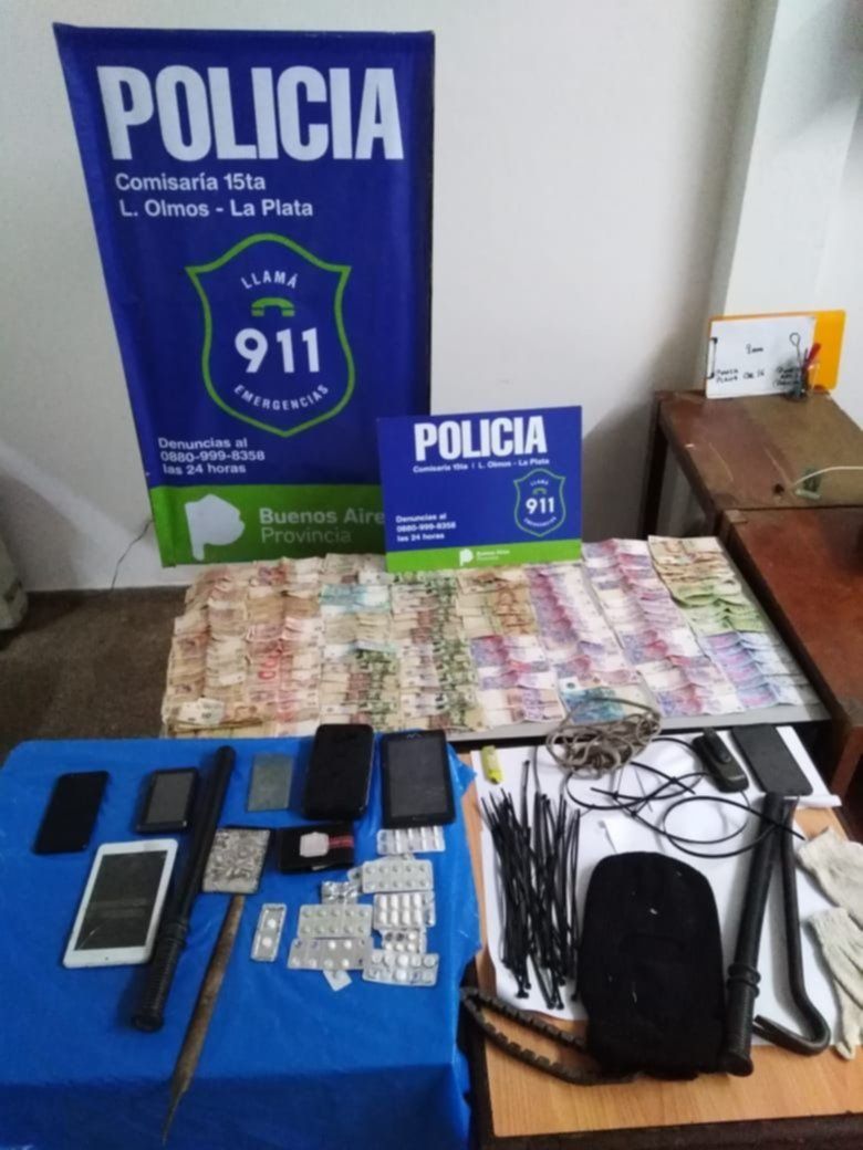 Así fue cómo lograron interceptarlos en Ruta 36 y 80 para posteriormente realizar una requisa dentro del vehículo. Allí, incautaron 9.280 pesos, cuatro precintos entrelazados listos para maniatar, 31 precintos plásticos, un par de guantes, un pasamontañas, una barreta, dos bastones policiales de goma, una soga, siete celulares, psicofármacos y una lima.