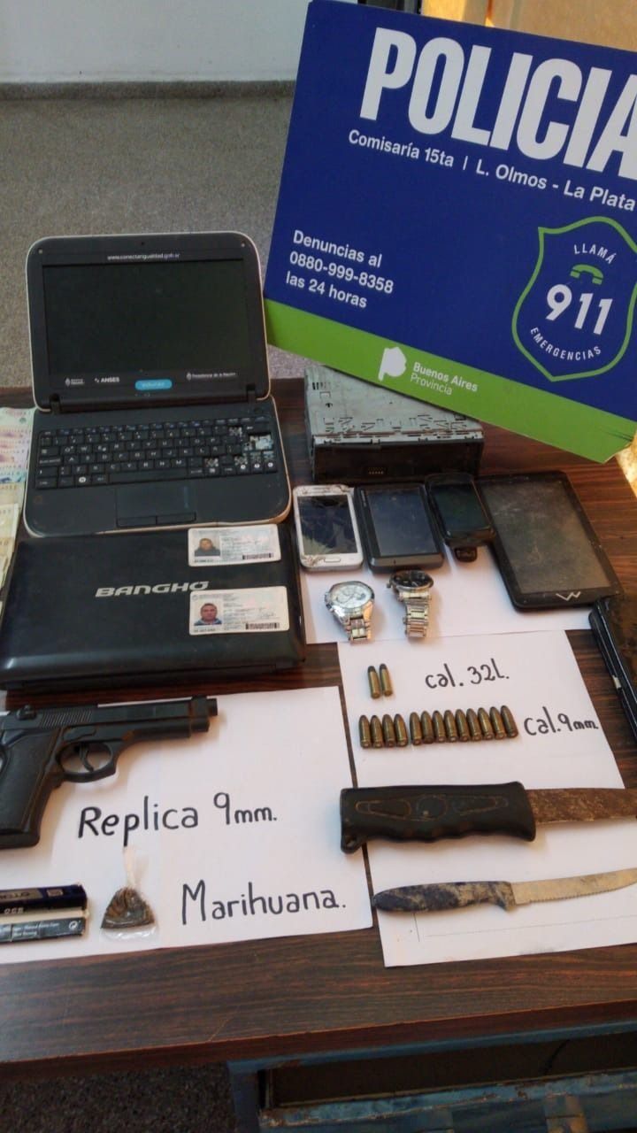 Durante el procedimiento, las autoridades identificaron a los sospechosos y les incautaron una réplica de arma de fuego 9 milímetros, 13 municiones del mismo calibre, dos balas calibre 32 largo, dos cuchillos, 5.500 pesos, moneda extranjera (paraguaya y peruana), dos netbooks, un estéreo, dos relojes, tres celulares, una tablet, marihuana y dos cédulas.