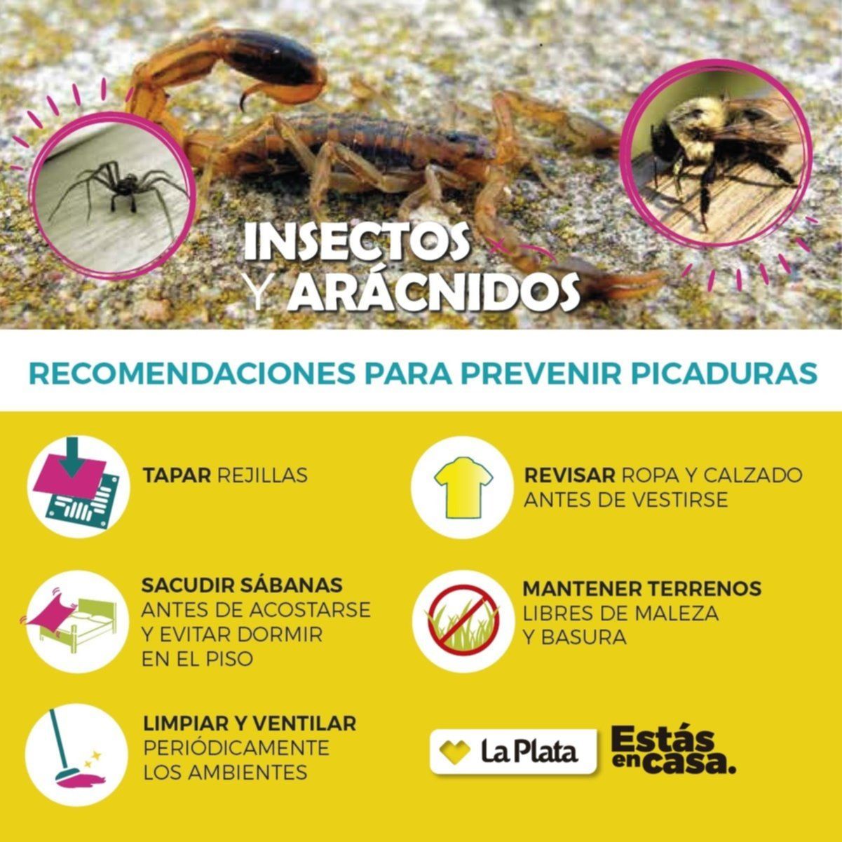 • Mantener limpio y ventilado el interior de la vivienda; evitar caminar descalzo, sacudir la ropa y el calzado antes de vestirse; revisar la ropa de cama antes de acostarse; colocar rejillas sanitarias en desagües de ambientes y sanitarios y controlar la entrada y salida de las cañerías.