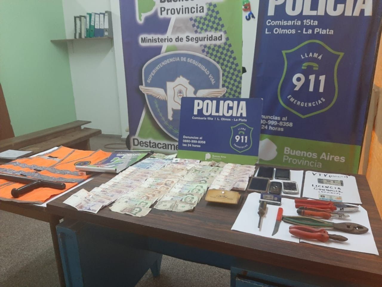 Asimismo, dentro del vehículo se encontraron cinco celulares, tres pinzas, un destornillador, un cuchillo Tramontina, un chaleco refractario de la Policía Federal Argentina y una tonfa, entre otros elementos de interés para la causa.