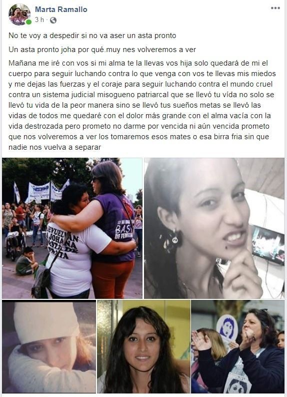 La mujer, que desde hacía meses reclamaba la entrega de los restos de su hija para darles sepultura, expresó: "Mañana me iré con vos, sí, mi alma te la llevás vos, hija. Solo quedará de mí el cuerpo para seguir luchando contra lo que venga. Con vos te llevás mis miedos y me dejás las fuerzas y el coraje para seguir luchando contra el mundo cruel, contra un sistema judicial misógino patriarcal que se llevó tu vida".