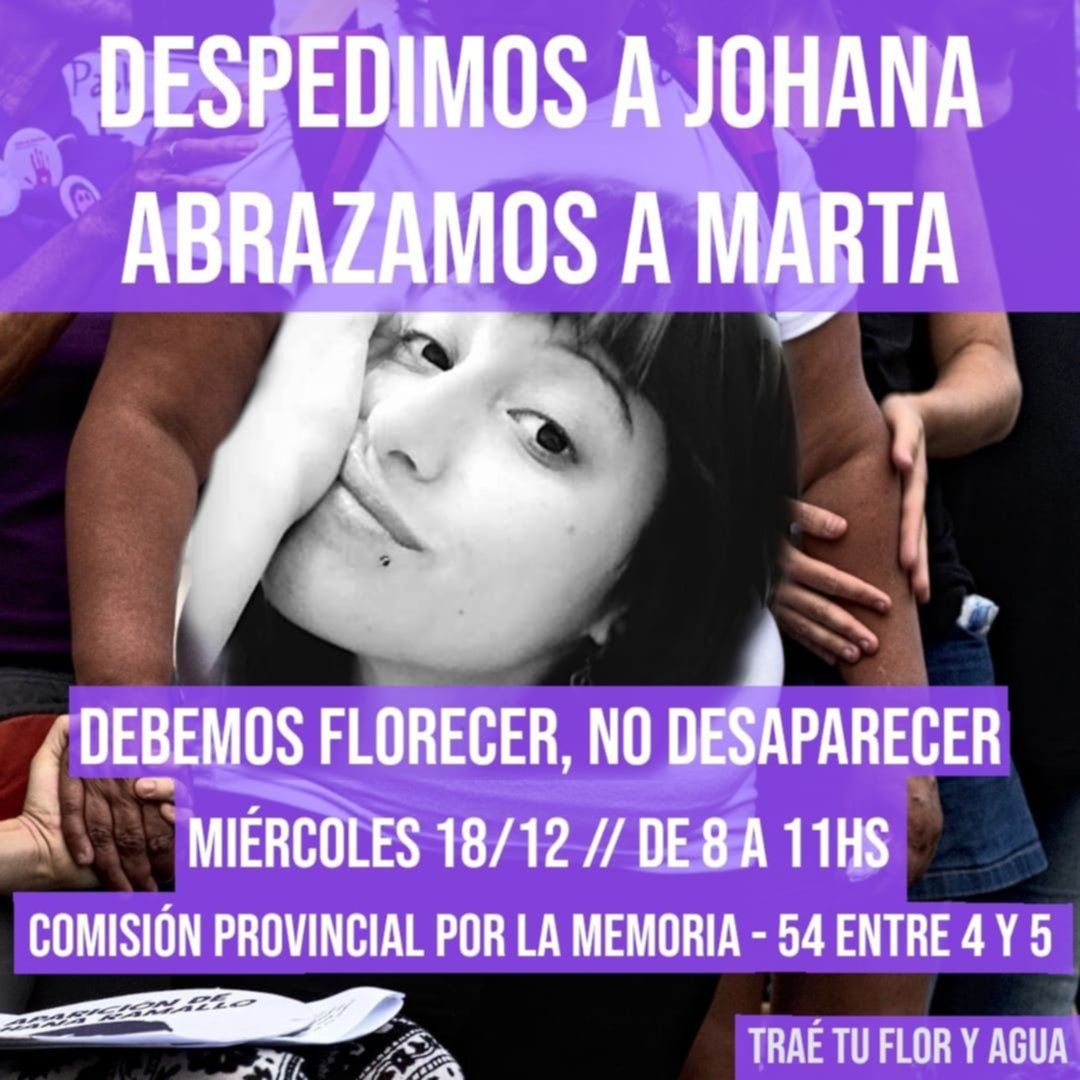 "Despedimos a Johana, abrazamos a Marta". Bajo esa consiga, este miércoles despedirán a Johana Ramallo, la joven que desapareció en julio de 2017 en La Plata en un presunto caso de trata de personas y de quien solo se encontró parte de su cuerpo un año después en Berisso. A horas de la inhumación de sus restos, la mamá volvió a usar las redes sociales para dejarle un mensaje a su hija.