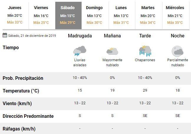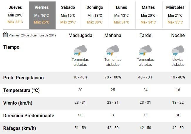 Para el fin de semana, en tanto, se espera que las condiciones del tiempo comiencen a mejorar paulatinamente y los vecinos puedan disfrutar de un excelente fin de semana. Para el sábado se espera una mínima de 15°C y una máxima de 26°C, mientras que el domingo la temperatura irá de 14 a 27°C.