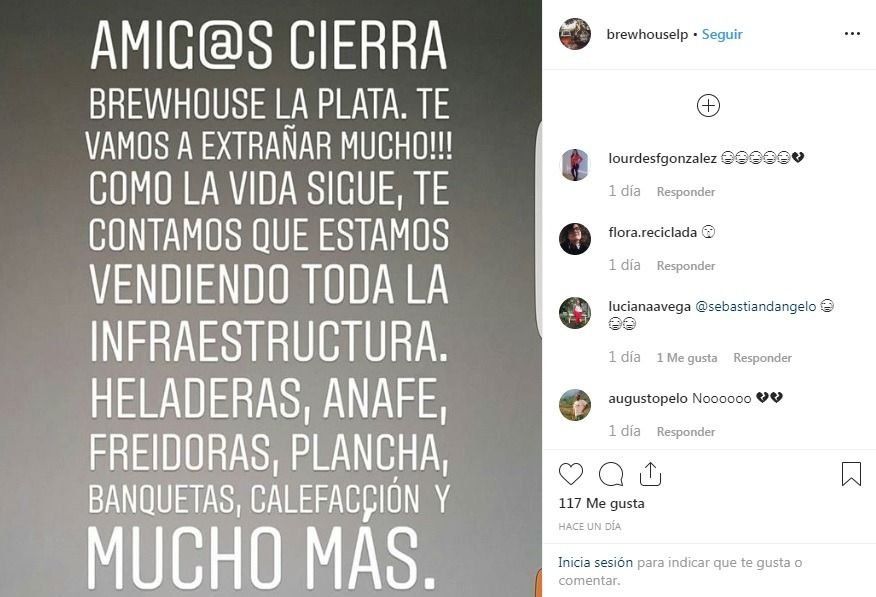 Y agregaron: “Como la vida sigue, te contamos que estamos vendiendo toda la infraestructura”. En ese sentido, detallaron que están liquidando sus heladeras, anafe, freidoras, plancha, banquetas, calefacción y “mucho más”.