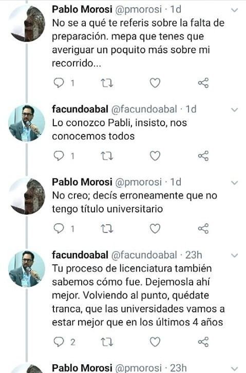 A raíz de este intercambio, Morosi le escribió una extensa carta a Abalo en la que desmintió, punto por punto, cada una de los agravios que recibió. La publicación del periodista está acompañada con las imágenes de sus títulos universitarios y las capturas del intercambio tuitero que mantuvieron. "Quiero aquí comentarles mi amargura por un episodio que viví hace una semana en la red social Twitter y del que aún no puedo reponerme ni logro salir de un desagradable estado de asombro", sostuvo el periodista en el escrito en con el que dio cuenta del ataque recibido, pero aún así llamó al funcionario de la UNLP a reflexionar sobre los sucedido.