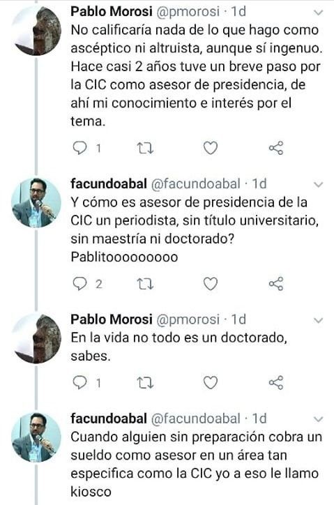 "Pablito estás obsesionado. ¿Qué hacen las jóvenes promesas cuando se ponen viejas y nadie llama para nada? Se recienten y se convierten en Twitteros", fue la dura respuesta que dio inició a la discusión. El funcionario de la casa de altos estudios fue más allá y hasta cuestionó los fundamentos de su nombramiento como asesor de la CIC.