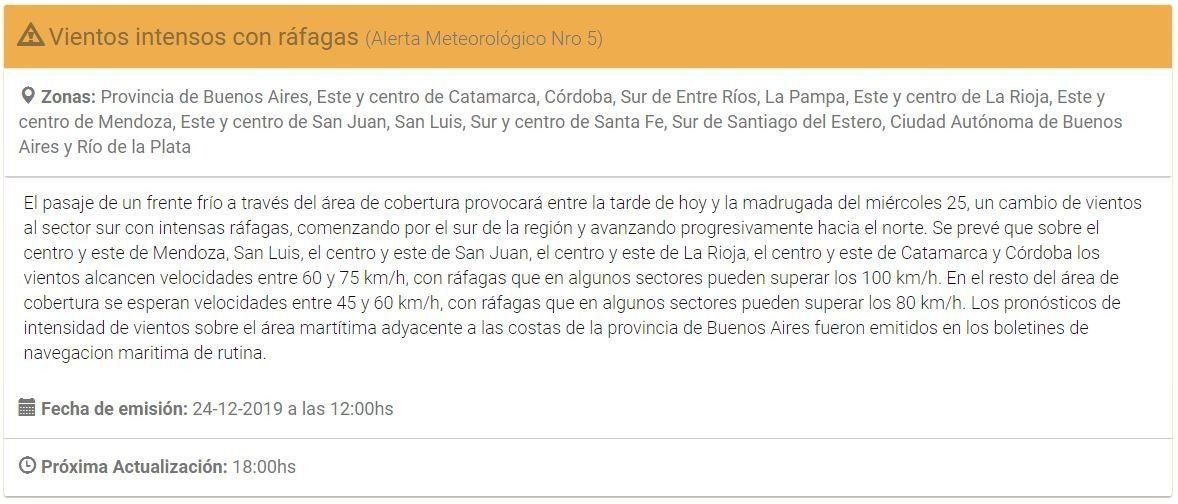 Los especialistas del SMN adelantaron indicaron que el alerta no solo incluye a la ciudad y la región, sino a gran parte de la Provincia de Buenos Aires, el este y centro de Catamarca, Córdoba, el sur de Entre Ríos, La Pampa, el este y centro de La Rioja, el este y centro de Mendoza, el este y centro de San Juan, San Luis, sur y centro de Santa Fe, sur de Santiago del Estero y hasta la Capital Federal. De acuerdo con el aviso, en algunas zonas, incluso, las ráfagas de viento podrían llegar hasta los 100 km/h. En la ciudad, en tanto, se espera que las más rápidas se ubiquen apenas por debajo de esa velocidad.